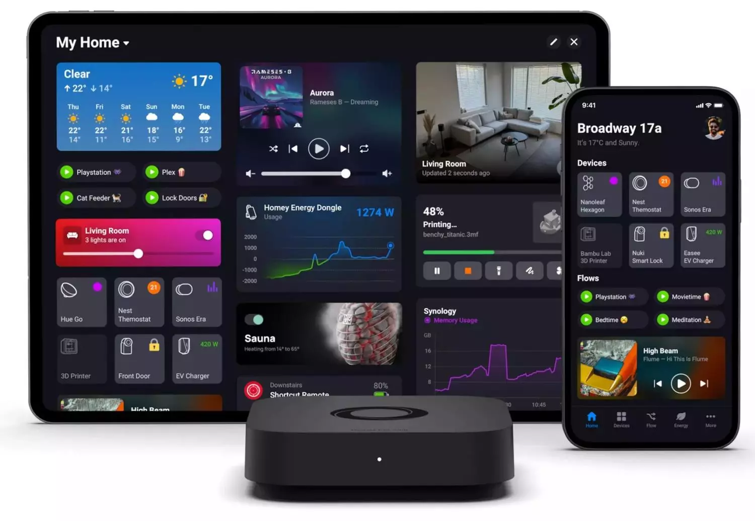 Athom Homey Pro Mini smarthus er «lillebroren» til Homey Pro. Her kan du selv styre alle komponenter som følger med i pakken helt uten månedsavgift.