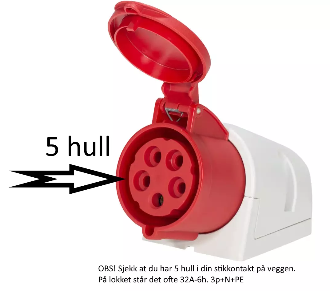 OBS! Se på bildene. Pluggen inn har 5 ledere (pinner). Sjekk at din kontakt på veggen har 5 hull. Har den bare 4 ledere (hull), mangler du N-lederen. Ta i såfall kontakt med oss for veiledning.
